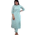 The set includes matching straight pants that offer a clean and contemporary finish, making it ideal for office wear, casual outings, or semi-formal occasions. Designed with breathable fabric and minimal embellishment, this ensemble strikes the perfect balance between tradition and modern charm.