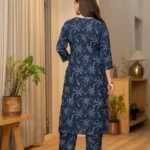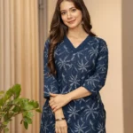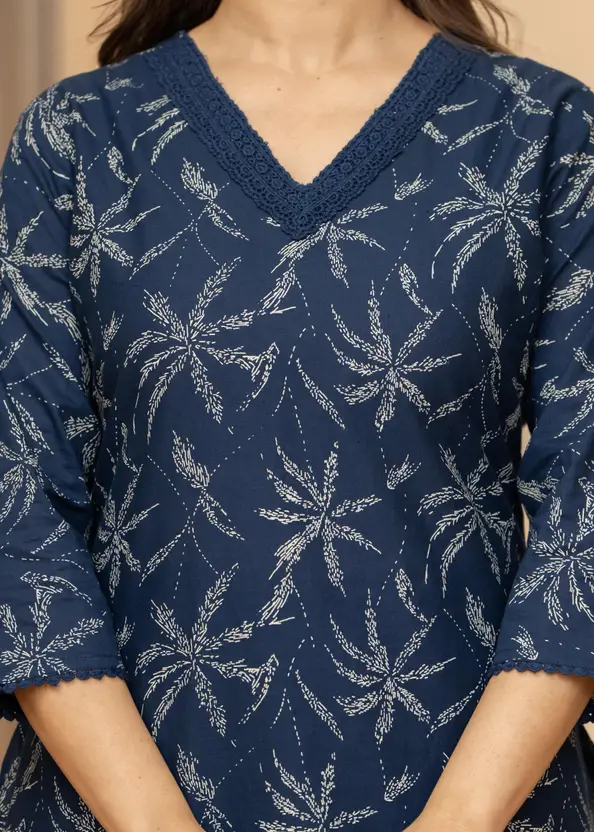 Look effortlessly elegant in this navy blue printed kurta. It features a flattering V-neck and 3/4 sleeves, both beautifully detailed with delicate crochet lace. The striking all-over leaf print makes it a versatile and stylish choice for any occasion.