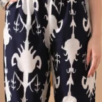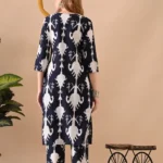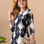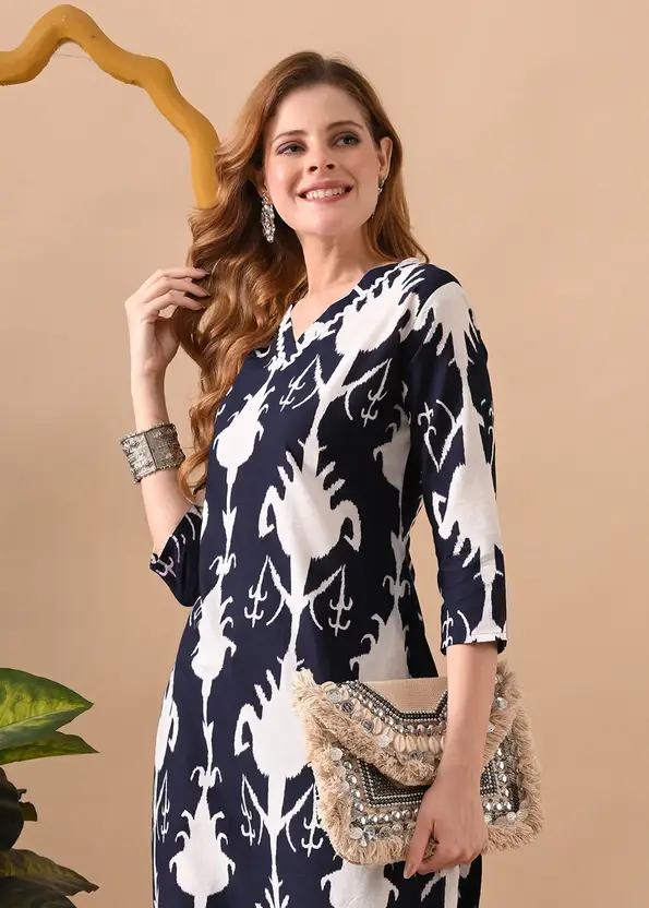 Make a classy statement with this navy blue and white Ikat printed pure cotton kurta set. Featuring a stylish V-neck and 3/4th sleeves, this outfit blends traditional charm with modern elegance. Crafted from breathable cotton fabric, it’s perfect for daily wear, office looks, or casual gatherings.