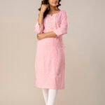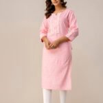 Add a soft and graceful touch to your ethnic collection with the Zohra Baby Pink Chikankari Kurta. Crafted in breathable cotton, this straight-cut kurta features: