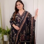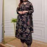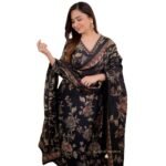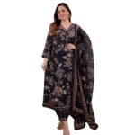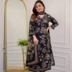 Make a graceful statement with this elegant black floral kurti set. Designed with rich floral patterns in subtle earthy tones, this three-piece ensemble includes a matching dupatta and tapered pants. Crafted from soft, breathable fabric, it’s ideal for festive gatherings, family functions, or even elegant office wear.